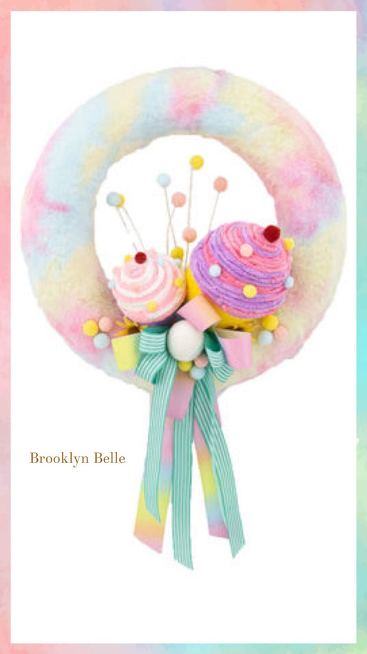 Rainbow Cotton Candy Spring Wreath with Cupcakes