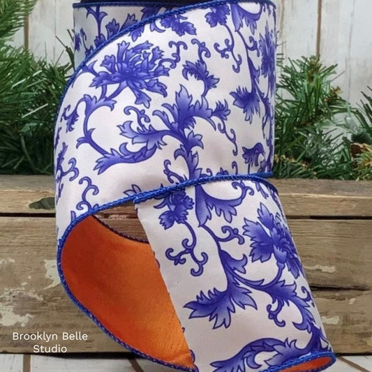 1.5" Blue And Orange Chinoiserie Ribbon