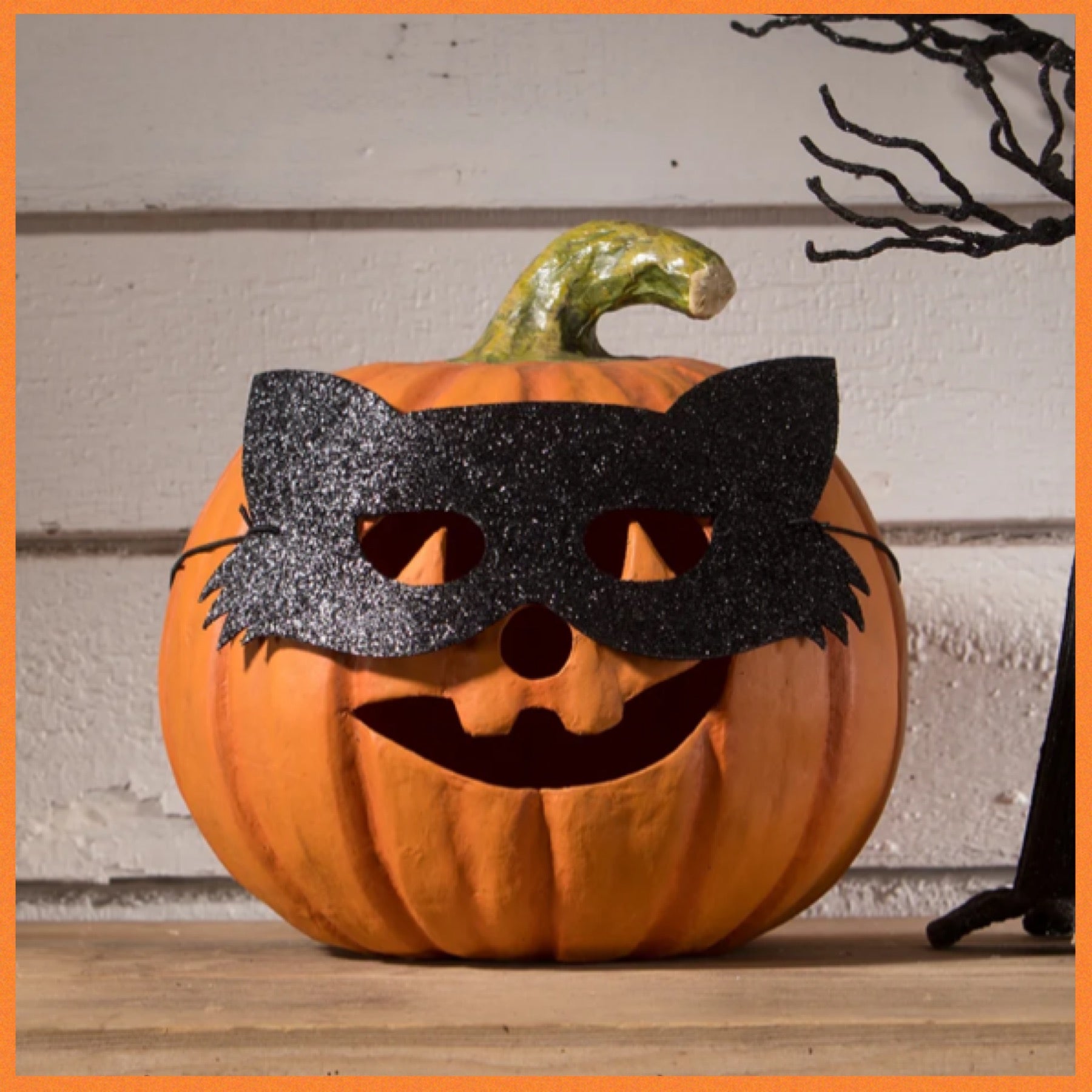 Bethany Lowe Cat Masquerade Pumpkin Orange Jack O' Lantern Bethany Lowe Halloween Orange Cat Pumpkin Decoration